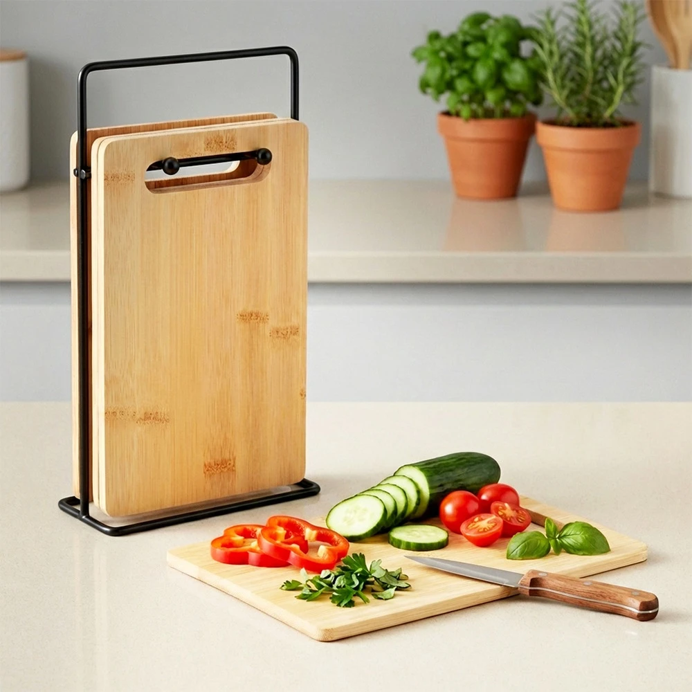 ✅ Zestaw 4 szt. desek do krojenia na stojaku - Praktyczny komplet składający się z czterech desek do krojenia oraz stojaka, przeznaczony do codziennego przygotowywania i serwowania posiłków. Każda deska ma wymiary 22 x 14 cm i grubość 0,7 cm. Wymiar zewnętrzny stojaka z deskami to 15 x 7 x 27 cm.