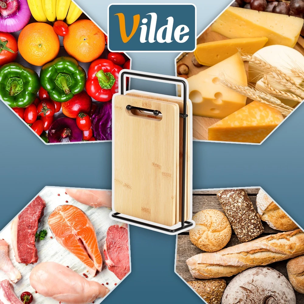 Zestaw desek do krojenia to funkcjonalne i estetyczne rozwiązanie do każdej kuchni. Stojak pomoże nam uniknąć bałaganu i zapewni porządek w kuchni. Taka forma przechowywania desek pozwoli na odpowiednią organizację przestrzeni w kuchni, a deski będą zawsze na swoim miejscu. Klasyczny wzór i kolorystyka sprawią, że zestaw pasuje do każdej kuchni. Oryginalny produkt marki Vilde. Wyprodukowano zgodnie z europejskimi standardami.