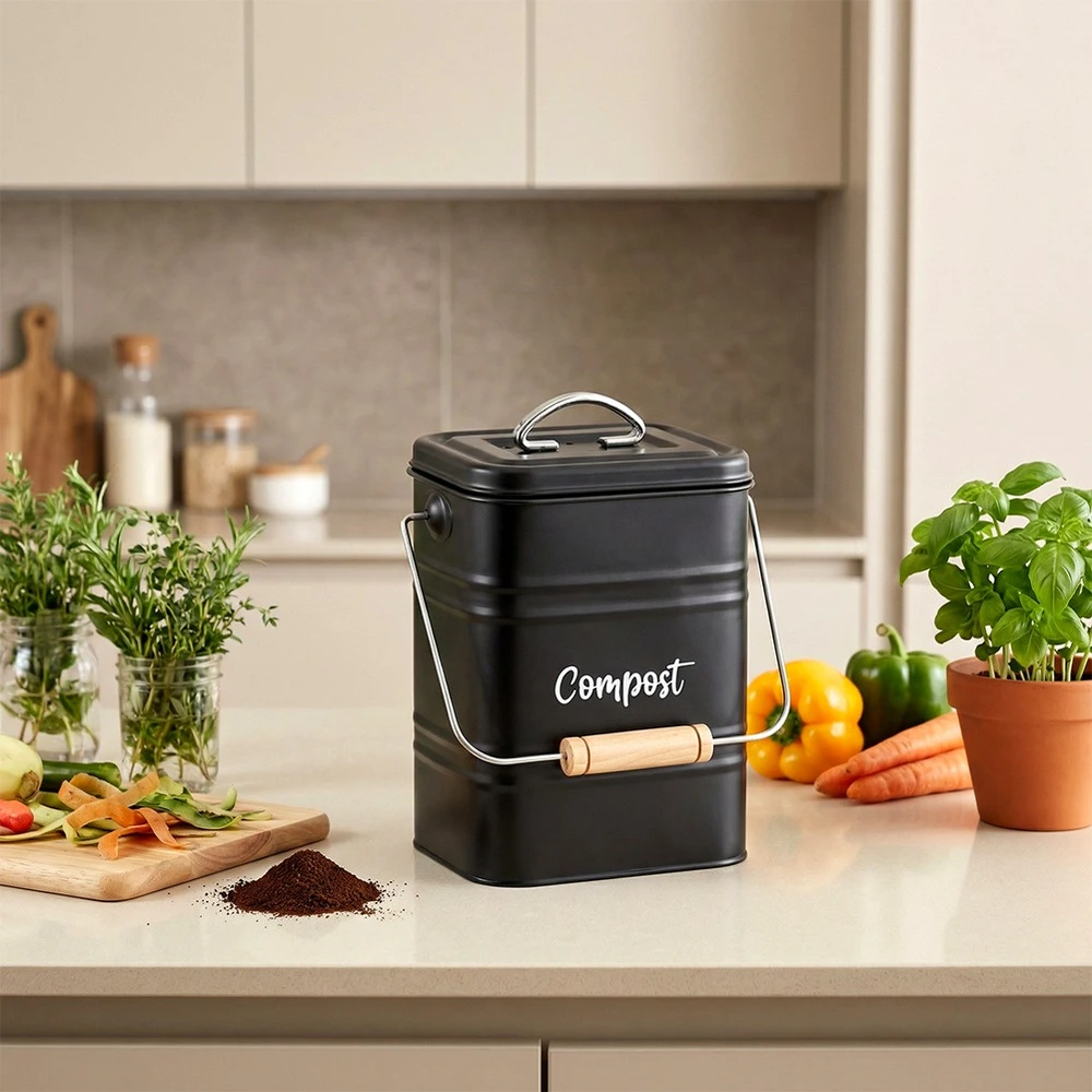 Metalowy kompostownik kuchenny z filtrem z aktywnego węgla. Idealny do przechowywania odpadków organicznych przeznaczonych do kompostowania.