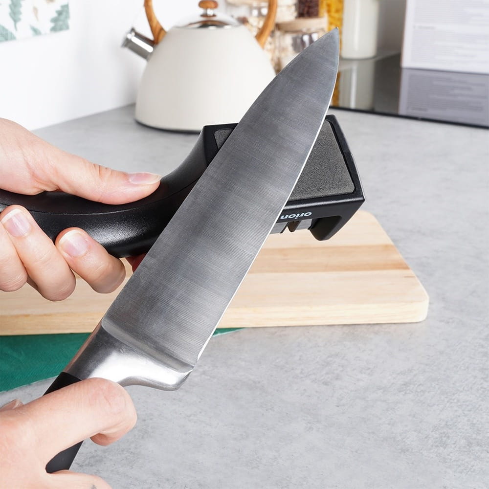 Ostrzałka do noży dwustopniowa. Odpowiednia dla noży bez ząbkowanych i ceramicznych ostrzy. Z jej pomocą możemy naostrzyć każdy nóż w sytuacji, gdy już się stępił. Posiada wygodną rączkę, która zapewni wygodne użytkowanie. Antypoślizgowa podstawa sprawi, że ostrzałka dobrze przylega do blatu. Dzięki ostrzałce ostrość noży jest zachowana nawet do sześciu miesięcy. Oryginalny produkt czeskiej marki Orion. Wyprodukowano zgodnie z europejskimi standardami.