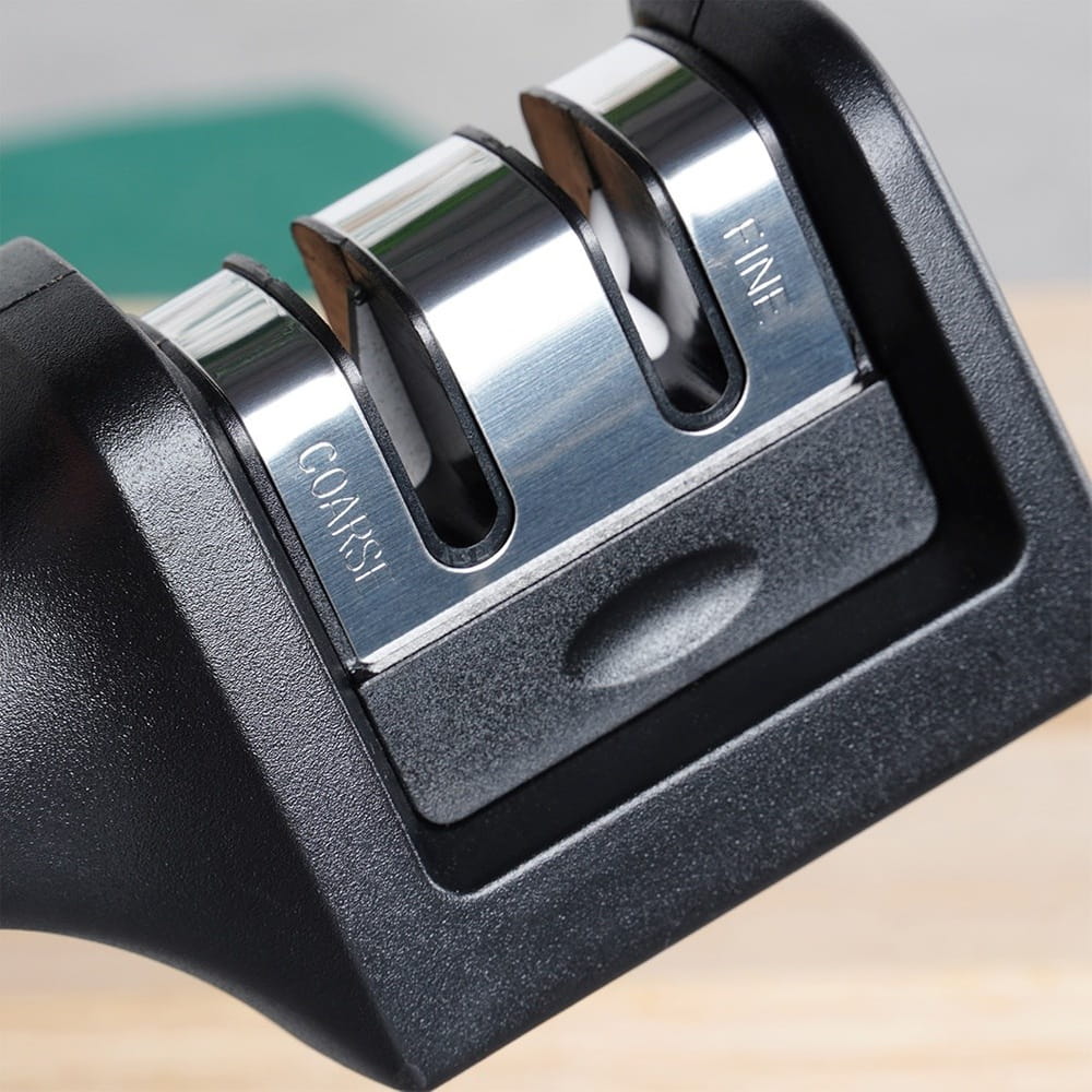 ✅ PRAKTYCZNA - Ostrzałka posiada dwie głowice: węglową do ostrzenia oraz ceramiczną do polerowania. Nadaje się do prostych noży kuchennych, np. szefa kuchni.