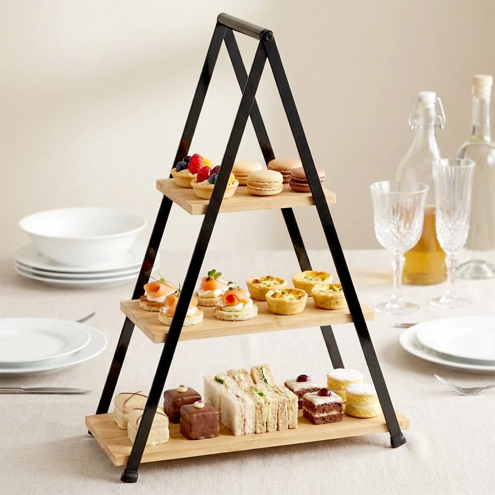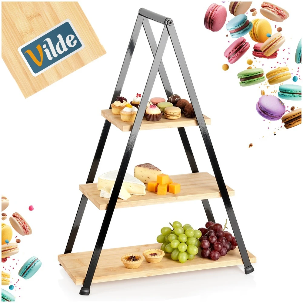 Piętrowa patera na ciastka, ciasto, owoce, przystawki, przekąski. Posiada 3 poziomy składające się z prostokątnych tac wykonanych z drewna bambusowego.