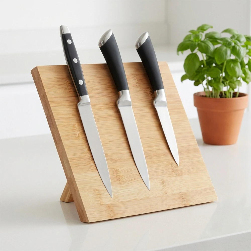 ✅ Wbudowany magnes zapewniający stabilne utrzymanie noży - Wewnętrzny magnes umożliwia bezpieczne przytrzymywanie noży bez konieczności stosowania szczelin czy otworów. Ostrza są chronione przed uszkodzeniem, a noże pozostają stabilne podczas przechowywania.
