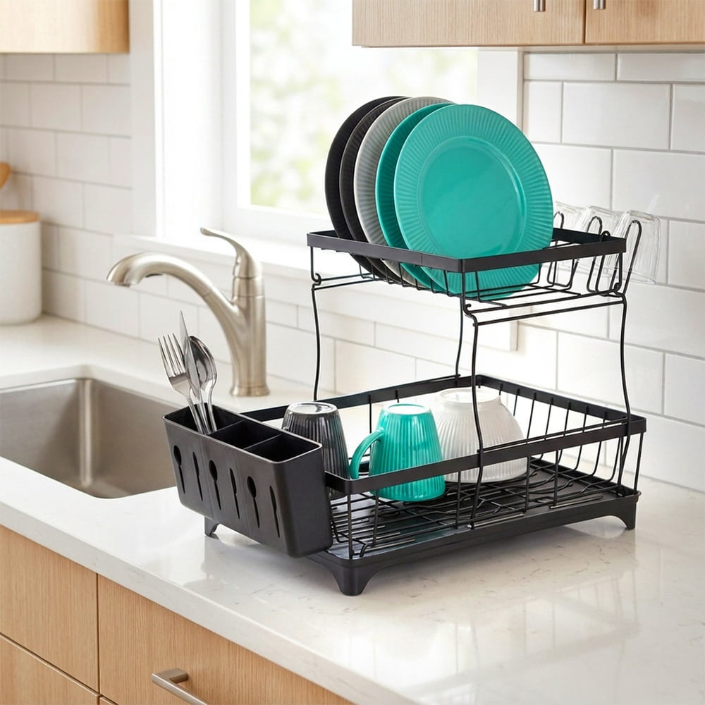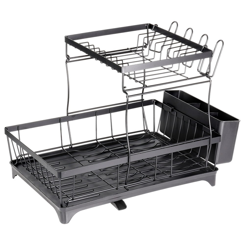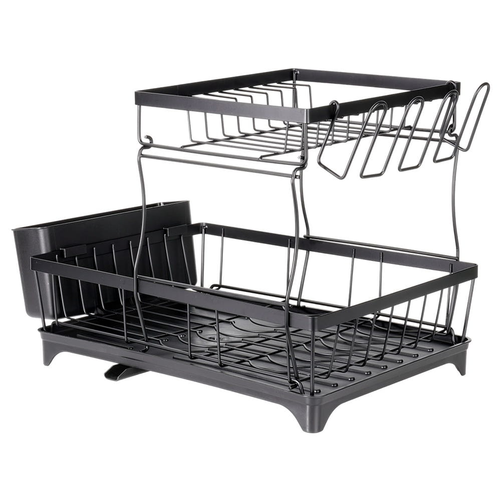 Pojemna, dwupoziomowa suszarka do naczyń w kolorze czarnym. Posiada miejsce na talerze, szklanki, kubki, ociekacz na sztućce oraz uchwyt na deski i tacę ociekową z wylewką.