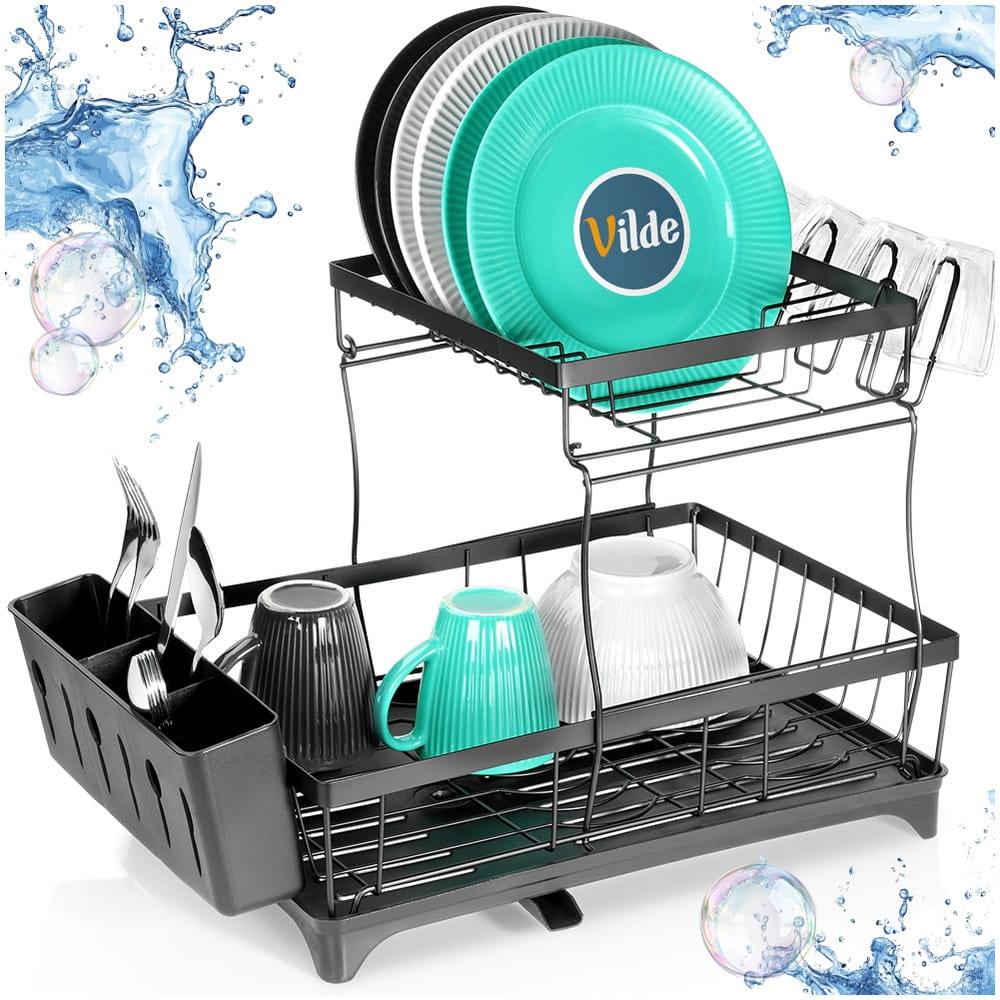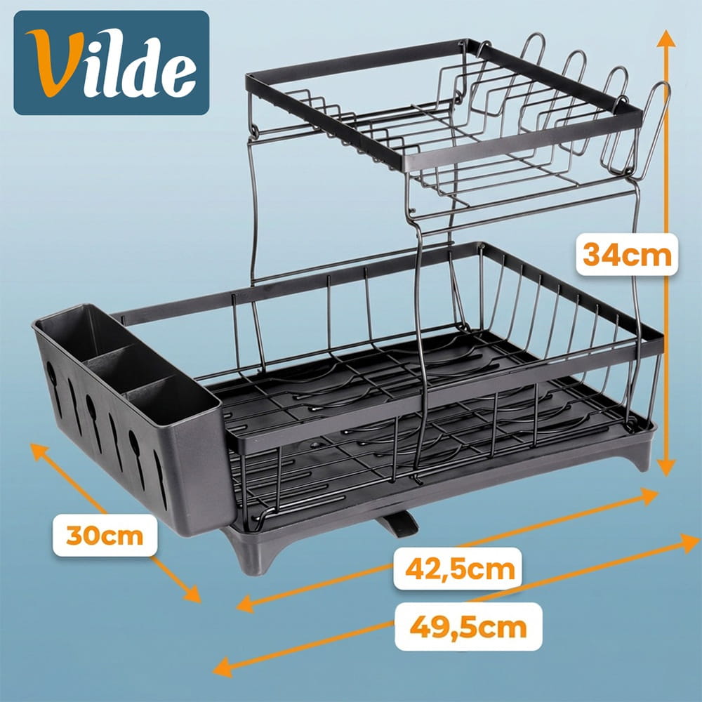 Dwupoziomowa, pojemna suszarka na naczynia z miejscem na talerze, sztućce oraz inne naczynia. Wykonana z wytrzymałych materiałów. Dzięki niej zapomnisz o nieuporządkowanych naczyniach i mokrych śladach na blacie szafek przy zlewie. Suszarka jest niezwykle pojemna, pozwala na równoczesne suszenie naczyń na dwóch poziomach. Niezbędny element wyposażenia kuchni. Oryginalny produkt marki Vilde. Wyprodukowano zgodnie z europejskimi standardami.