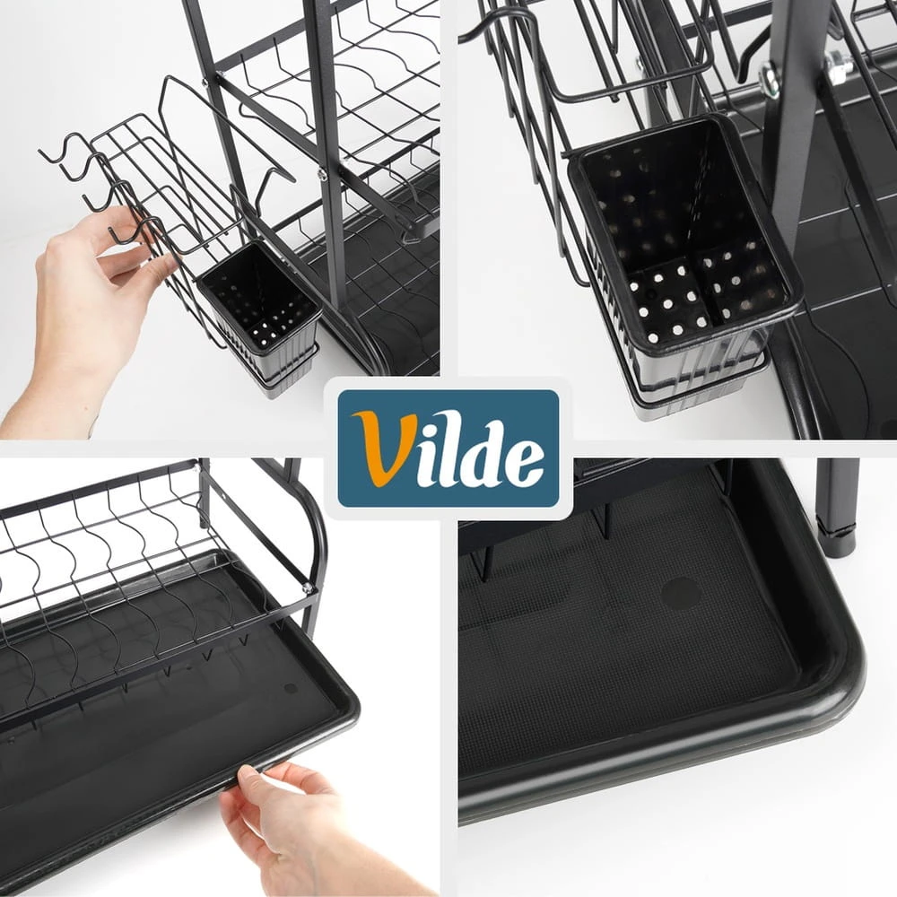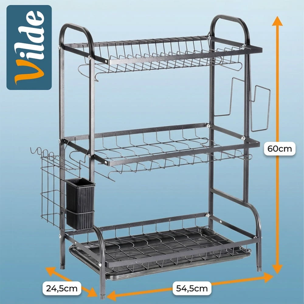 Trzypoziomowa, pojemna suszarka na naczynia z miejscem na talerze, sztućce oraz inne naczynia. Wykonana z wytrzymałych materiałów. Dzięki niej zapomnisz o nieuporządkowanych naczyniach i mokrych śladach na blacie szafek przy zlewie. Suszarka jest niezwykle pojemna, pozwala na równoczesne suszenie naczyń na dwóch poziomach. Niezbędny element wyposażenia kuchni. Oryginalny produkt marki Vilde. Wyprodukowano zgodnie z europejskimi standardami.