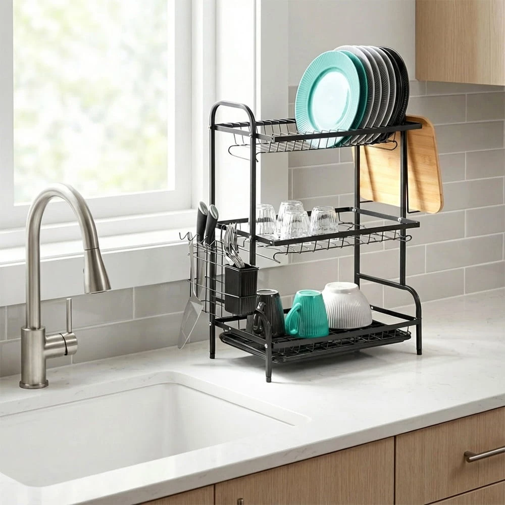 Pojemna, trzypoziomowa suszarka do naczyń w kolorze czarnym. Posiada miejsce na talerze, szklanki, kubki, ociekacz na sztućce oraz uchwyt na deski i wyjmowaną tacę ociekową.