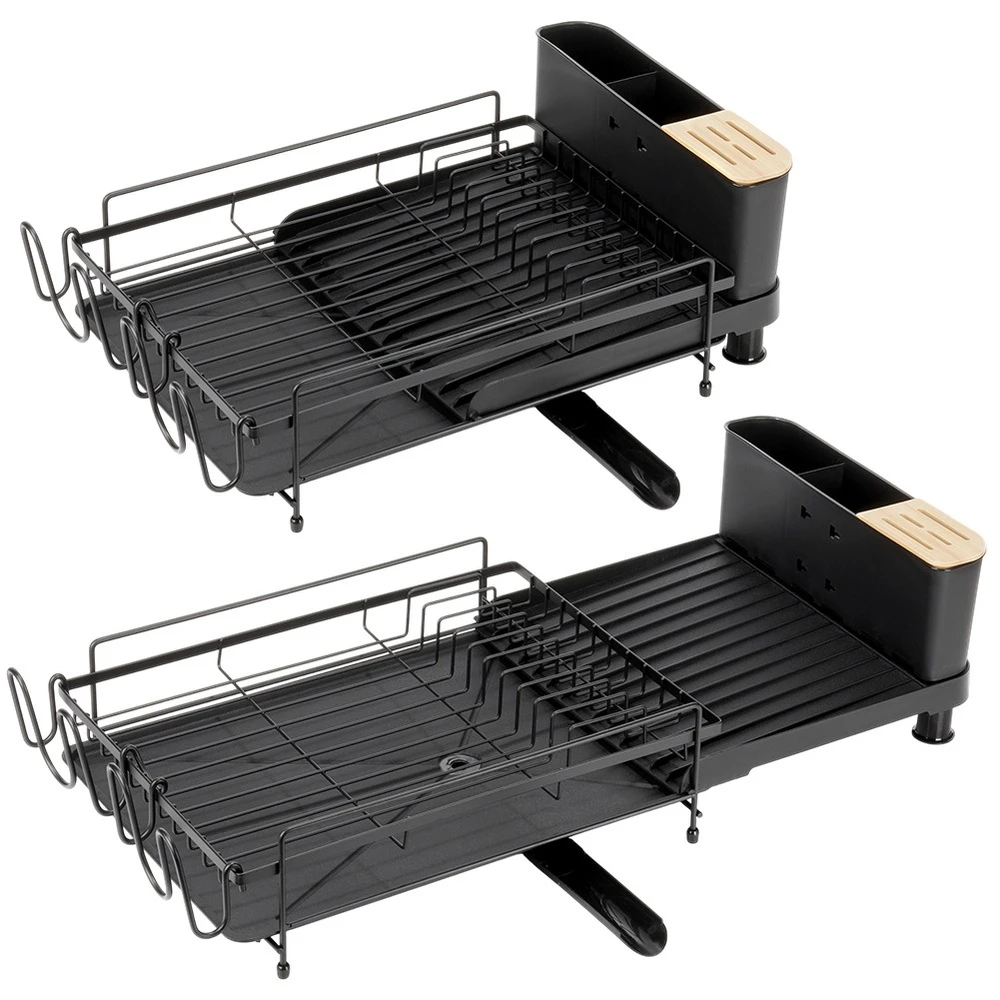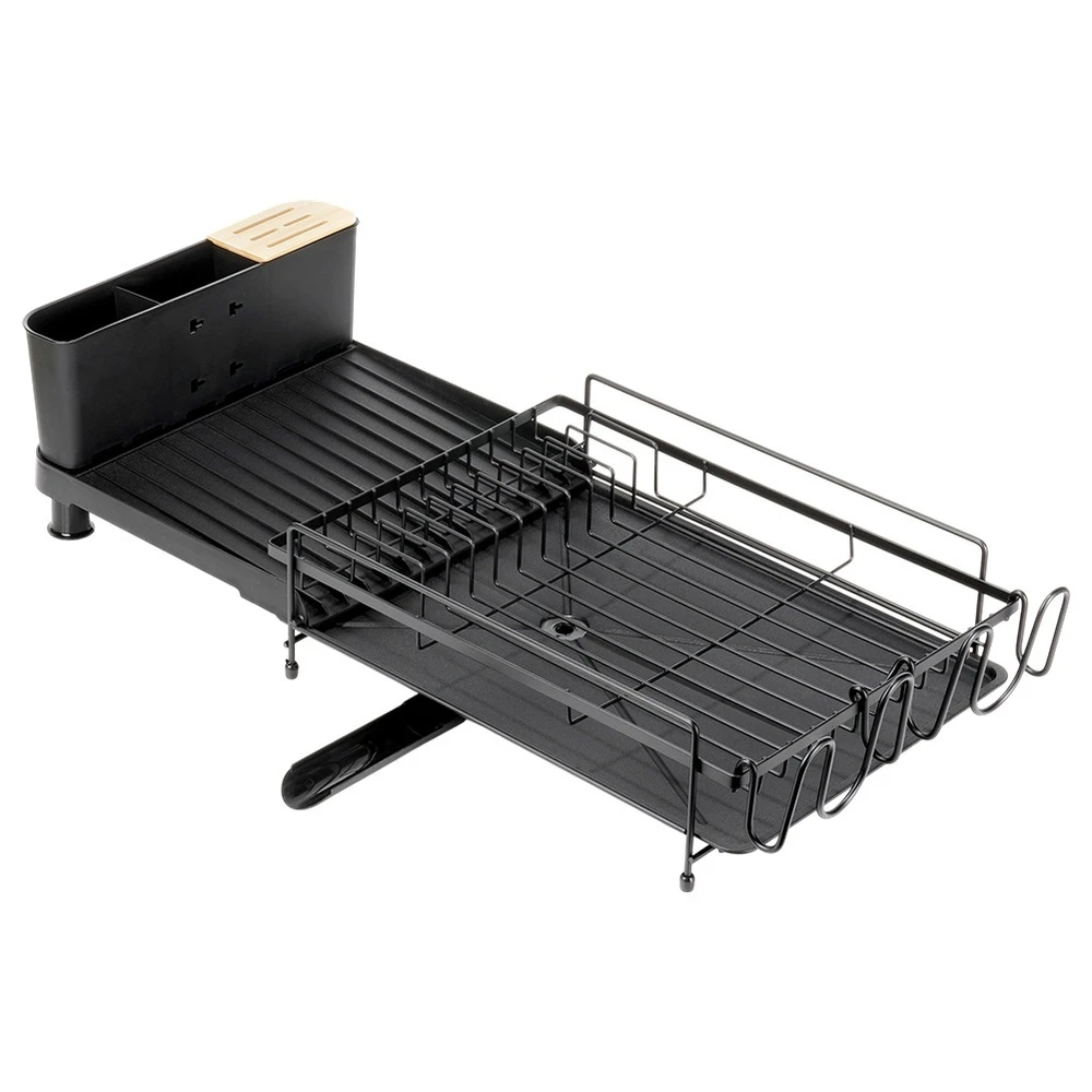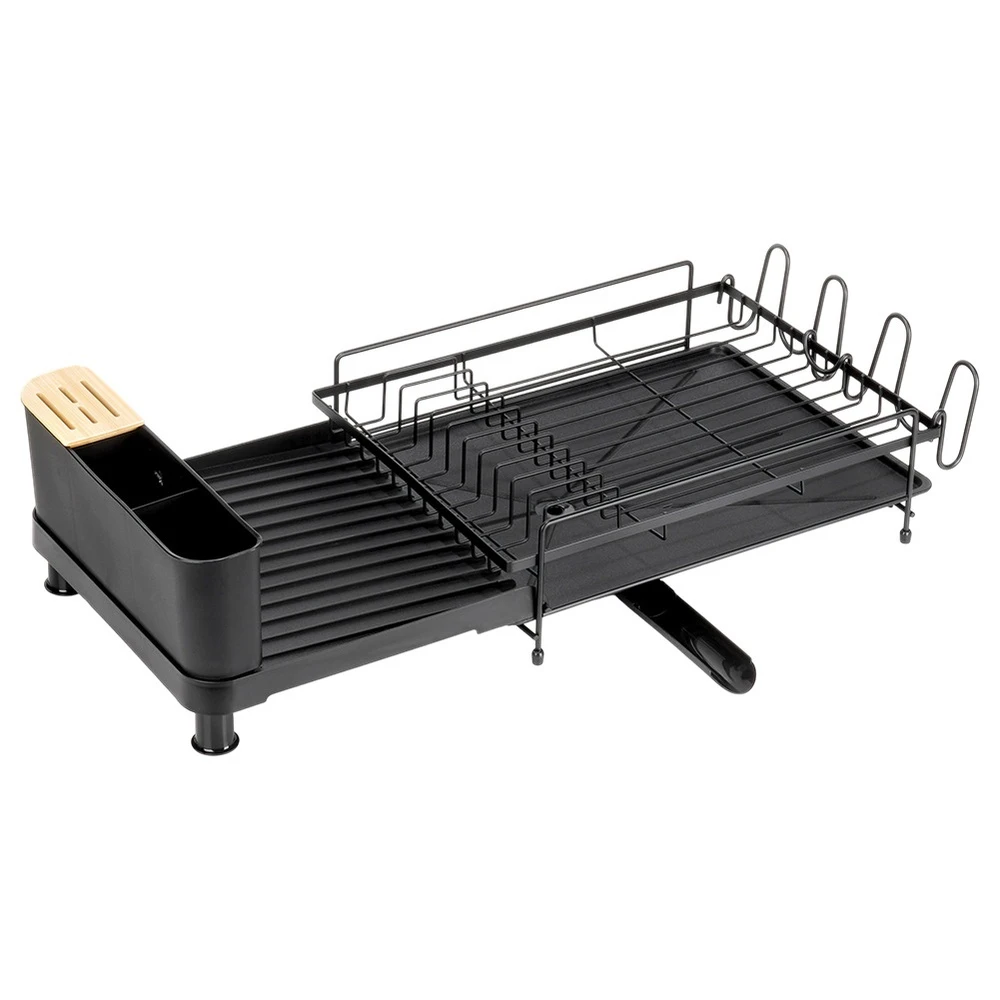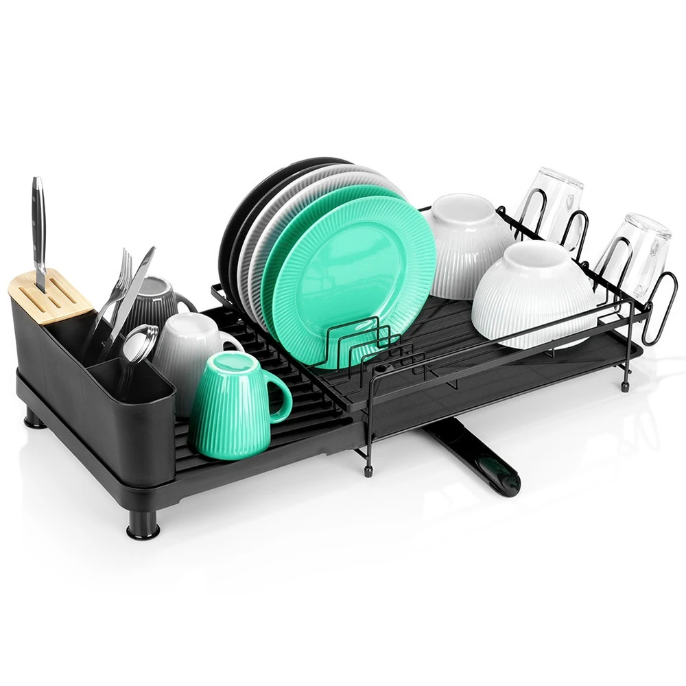 Rozsuwana suszarka do naczyń w kolorze czarnym. Wykonana z nierdzewnego metalu. Posiada miejsce na talerze, szklanki oraz sztućce. Wyposażona w tacę ociekową z wylewką.