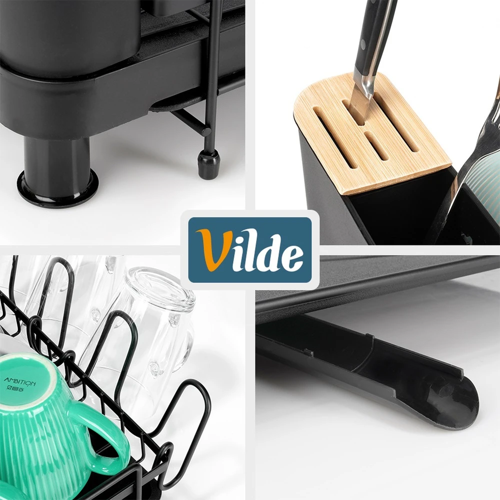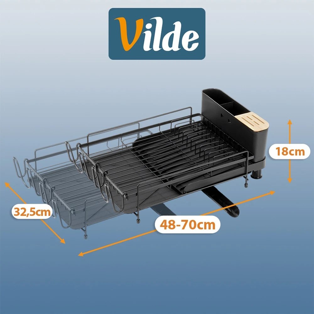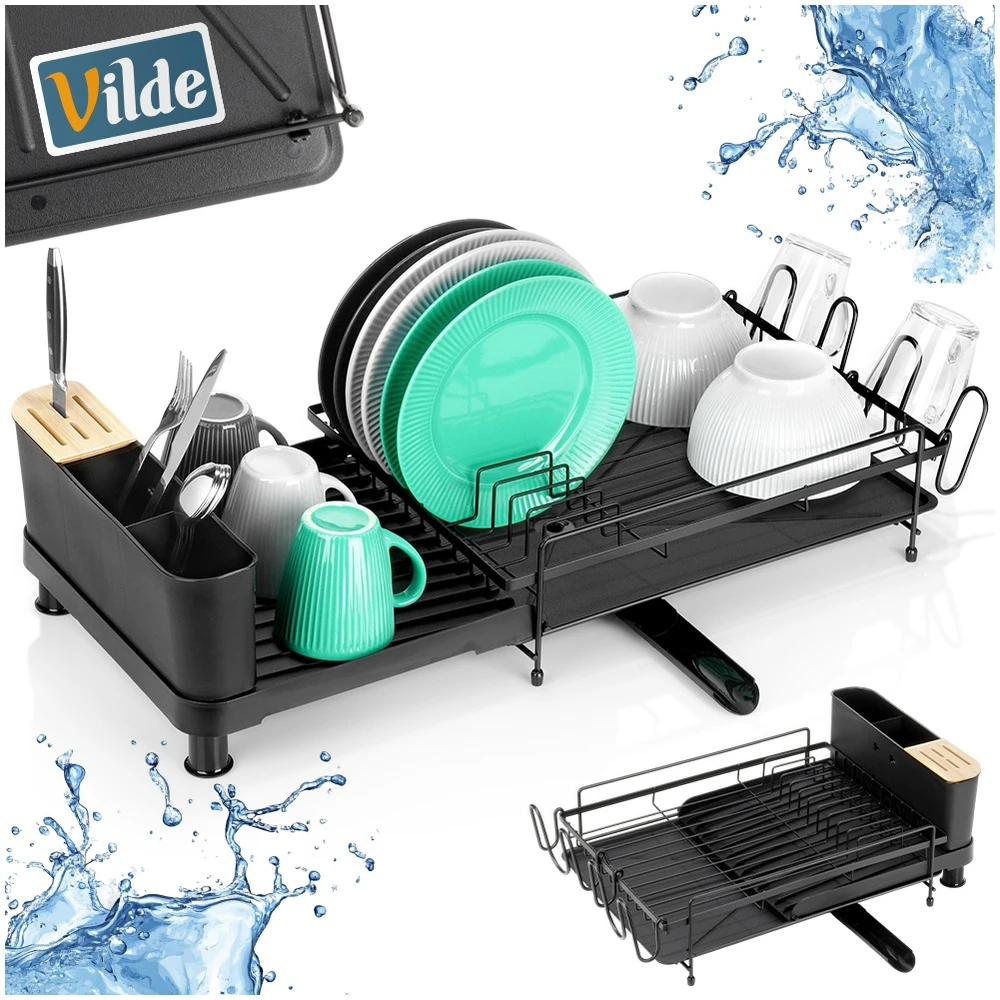 Pojemna, rozsuwana suszarka na naczynia z miejscem na talerze, kubki oraz sztućce. Wykonana z wytrzymałych materiałów. Dzięki niej zapomnisz o nieuporządkowanych naczyniach i mokrych śladach na blacie szafek przy zlewie. Suszarka to niezbędny element wyposażenia kuchni. Wykonana w eleganckim stylu, a zarazem funkcjonalna. Łatwa w czyszczeniu. Posiada wyjmowaną tacę ociekową z wylewką, dzięki czemu utrzymanie jej w czystości nie stanowi problemu. Oryginalny produkt marki Vilde. Wyprodukowano zgodnie z europejskimi standardami.