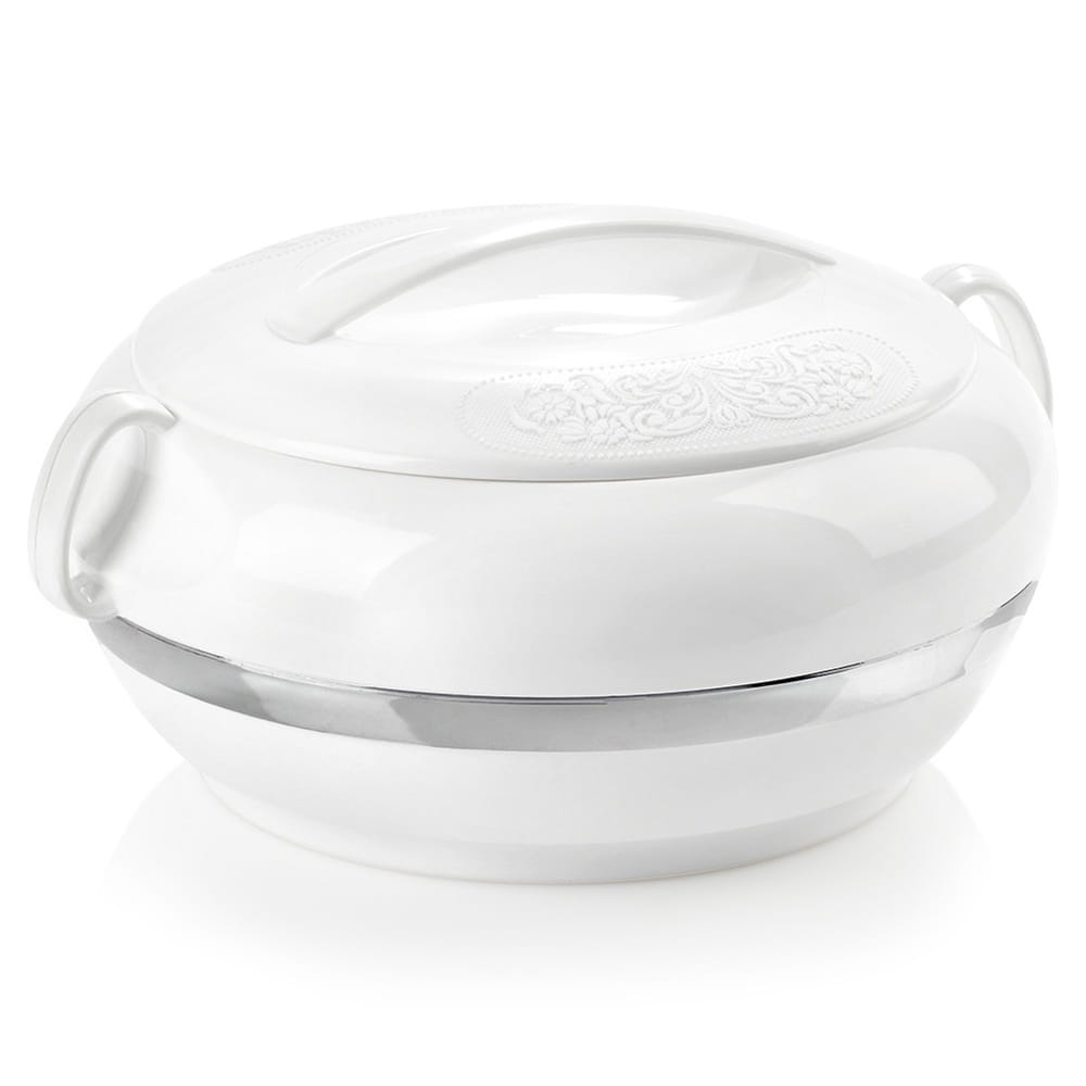 ✅ WYTRZYMAŁA - Termomisa z zewnątrz wykonana z tworzywa w kolorze białym, wewnątrz ze stali nierdzewnej. Pokrywa posiada efektowny dekor.