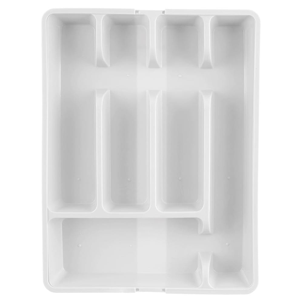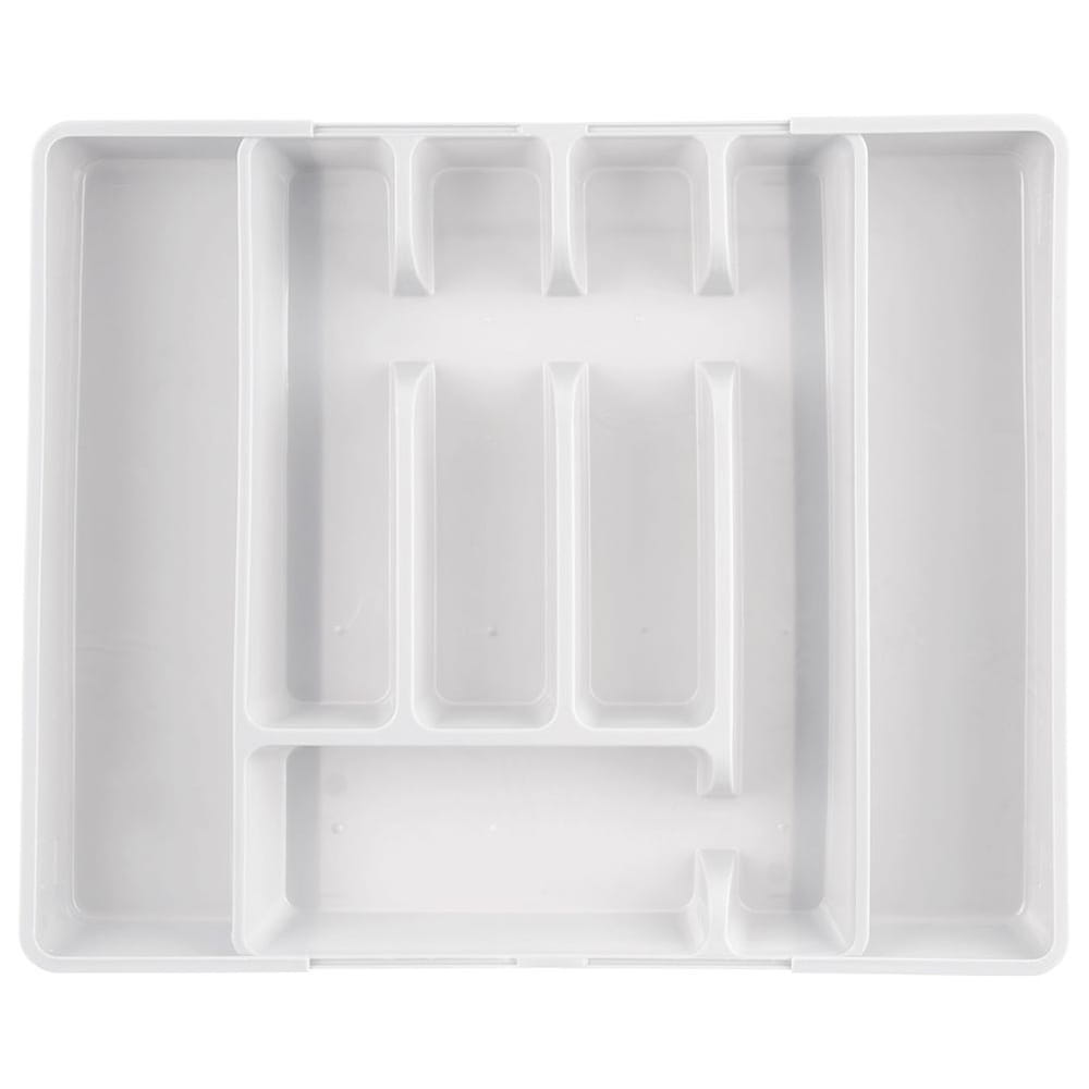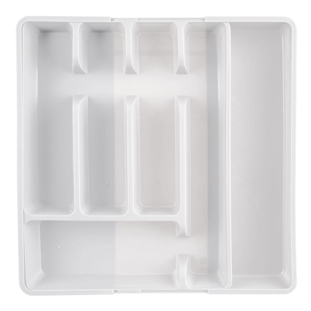 Regulowany organizer na sztućce oraz przybory kuchenne do szuflady. Wykonany z tworzywa w białym kolorze. W zależności od ustawienia posiada od 5 do 7 przegródek.