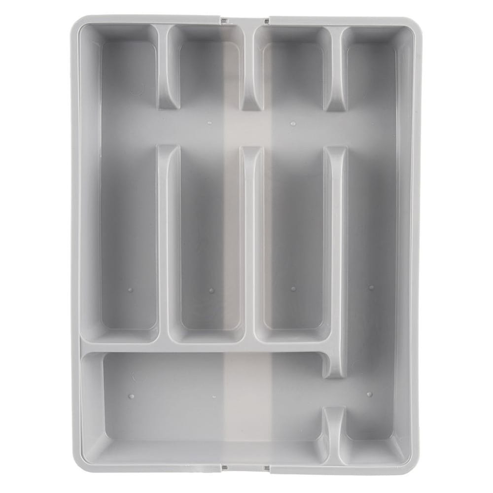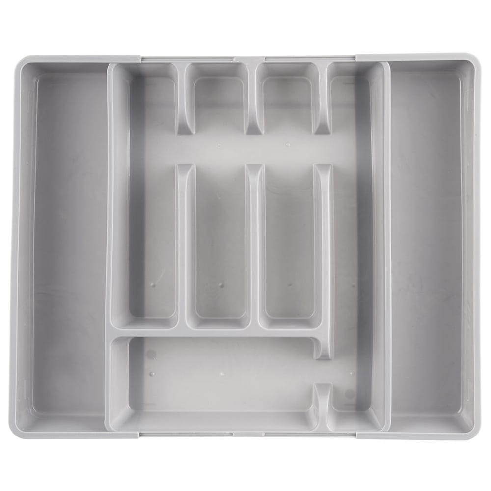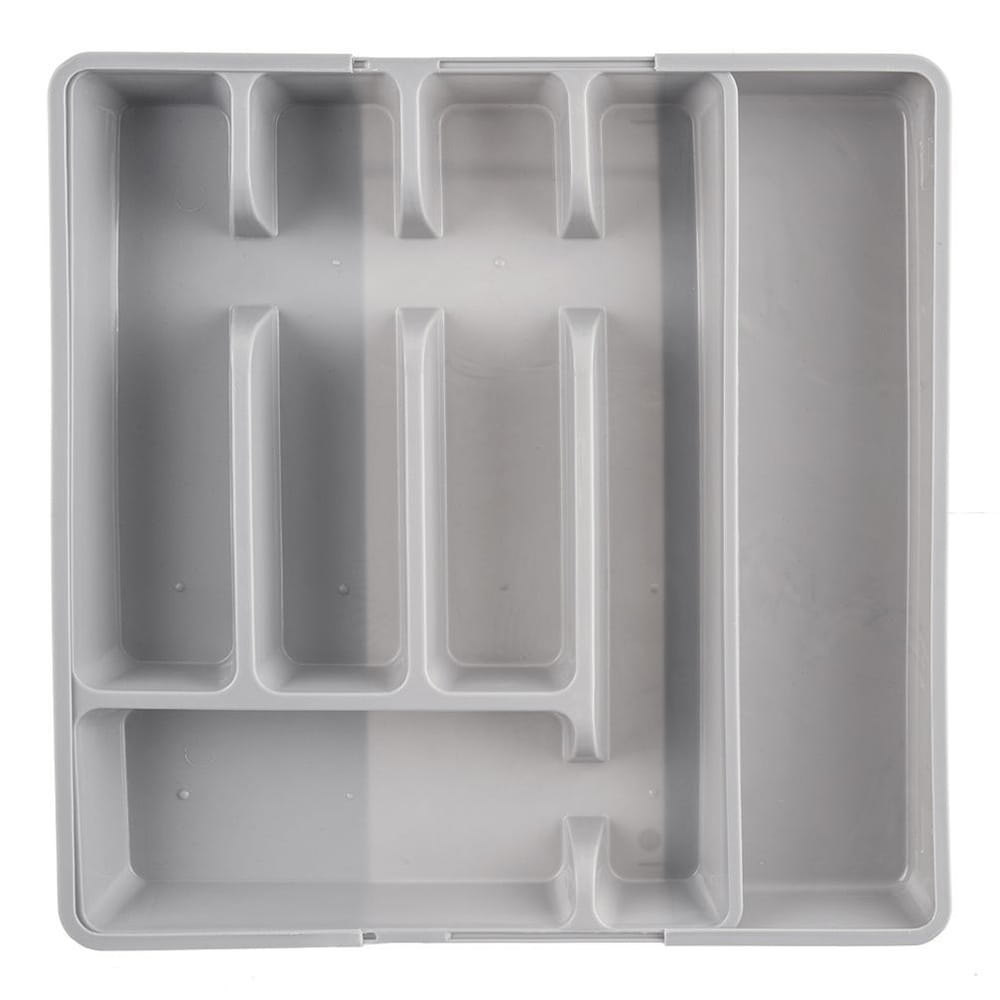 Regulowany organizer na sztućce oraz przybory kuchenne do szuflady. Wykonany z tworzywa w szarym kolorze. W zależności od ustawienia posiada od 5 do 7 przegródek.