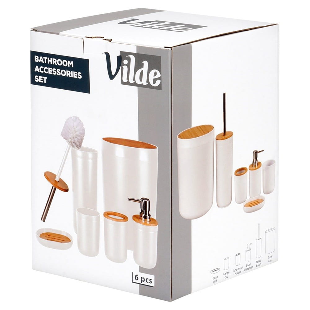 Komplet 6 akcesoriów łazienkowych przydatnych w każdym domu. W zestawie: 1x dozownik na mydło (7,5 x 16,5 cm, pojemność 320 ml ), 1x kubek na przybory (7,5 x 10,5 cm, pojemność 320 ml), 1x kubek (7,5 x 10 cm, pojemność 320 ml), 1x mydelniczka (13,5 x 8,5 x 2 cm), 1x kosz na śmieci (19,5 x 27 cm, pojemność 8 l) 1x szczotka do toalety ze stojakiem (10 x 40 cm). Przydatne w każdym domu. Solidnie wykonane będą stanowić wyjątkowy element dekoracyjny. Akcesoria prezentują się bardzo elegancko i są utrzymane w modnej kolorystyce. Klasyczny kształt sprawia, że pasują do każdego wnętrza. Oryginalny produkt marki Vilde. Wyprodukowano zgodnie z europejskimi standardami.
