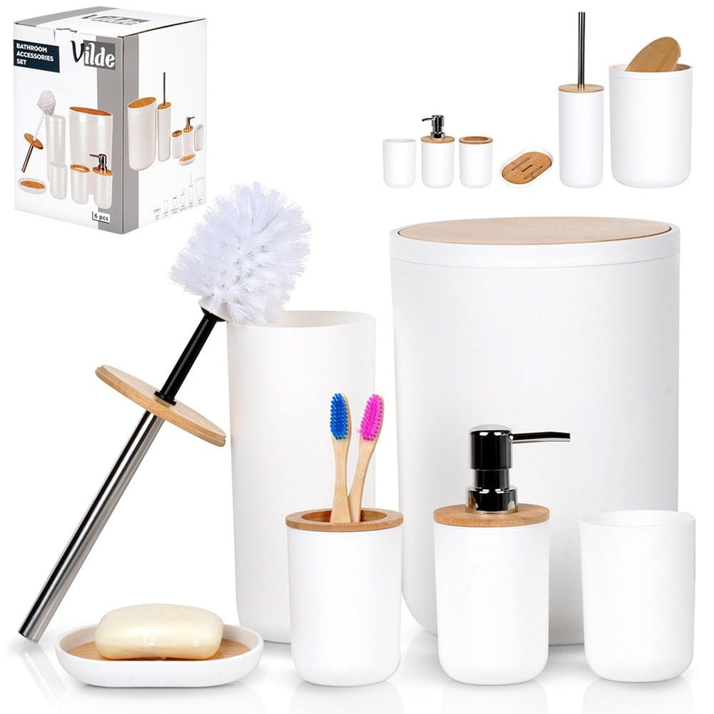 Przydatny zestaw akcesoriów łazienkowych w białym kolorze z elementami bambusowymi. Składający się z: dozownika na mydło, mydelniczki, 2x kubka, szczotki do WC oraz kosza na śmieci.